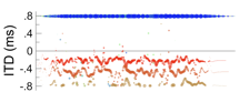 As with numerous other acoustic and neural models, the maximal model performs reasonably well when representing interaural time differences (ITD) under ideal listening conditions or when considering binaural signals exemplary of ideal listening conditions. In the examples below, for instance, five single or recurrent interaural phase differences (IPD) are considered: -0.2, -0.1, 0.0, 0.1, or 0.2 cycles, where IPD is estimated as ITD divided by frequency.
