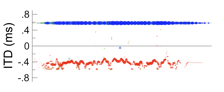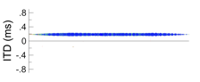 As with numerous other acoustic and neural models, the maximal model performs reasonably well when representing interaural time differences (ITD) under ideal listening conditions or when considering binaural signals exemplary of ideal listening conditions. In the examples below, for instance, five single or recurrent interaural phase differences (IPD) are considered: -0.2, -0.1, 0.0, 0.1, or 0.2 cycles, where IPD is estimated as ITD divided by frequency.